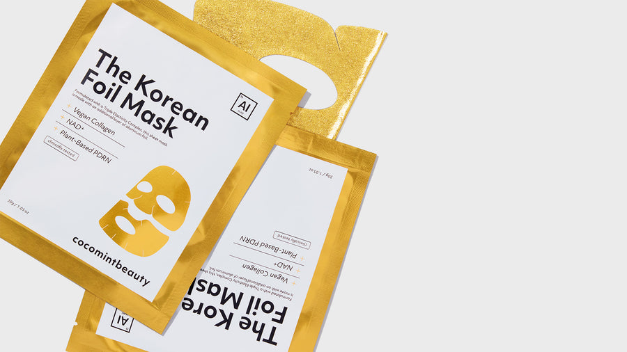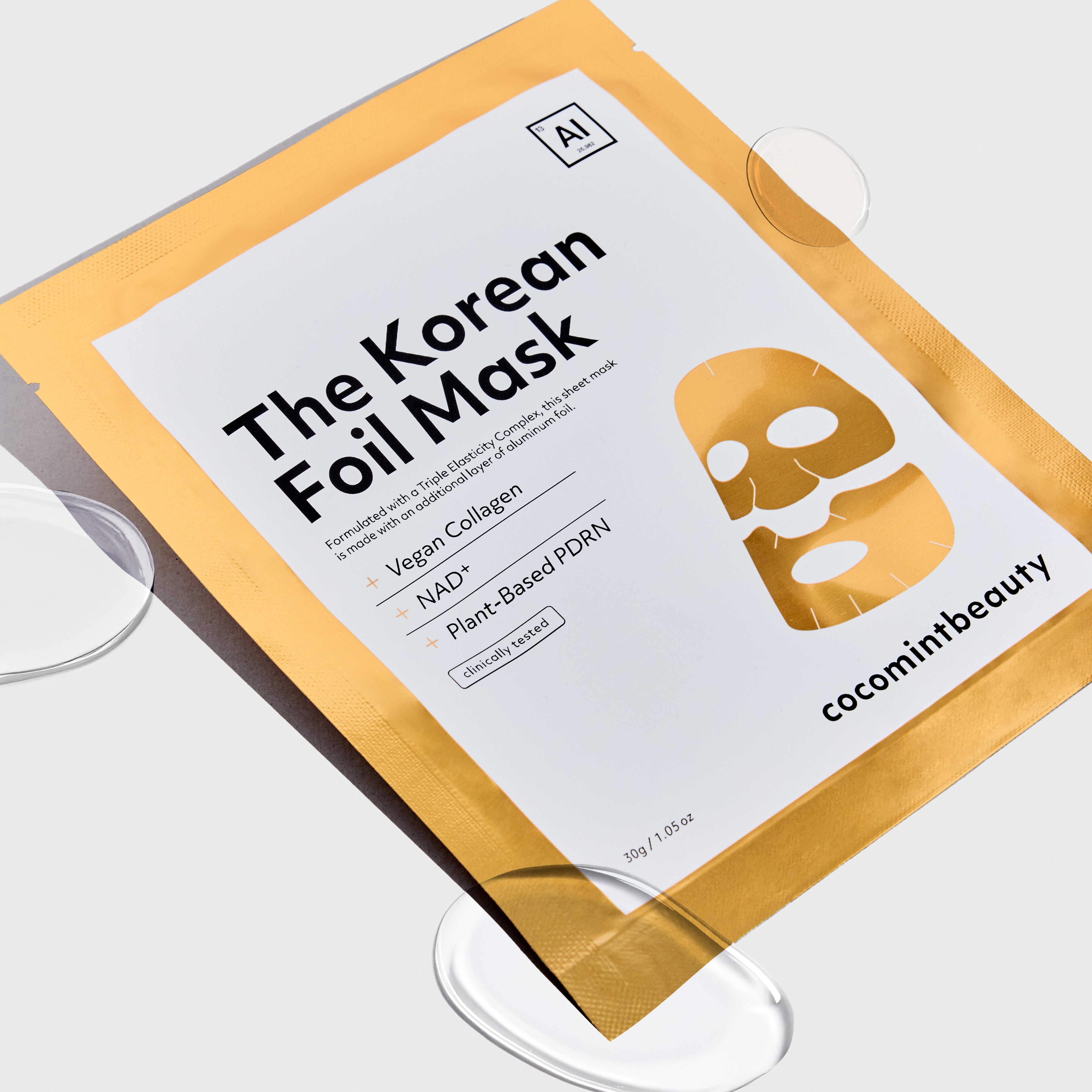 KOREAN FOIL MASK —A cotton sheet mask backed with a layer of foil that uses your body heat to open your pores and let the serum absorb deeper. It is modeled after Korean women wrapping their face in foil to achieve the same effect for plump, glowing skin.
